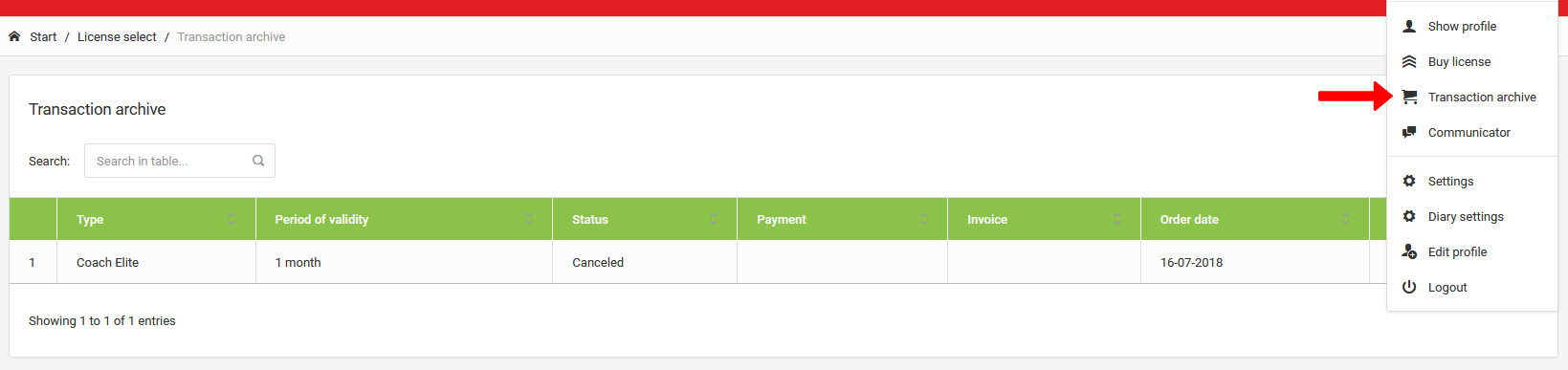 Für einzelne Zahlungen haben Sie Zugriff auf das Archiv aller Ihrer Transaktionen. Um auf das Archiv zuzugreifen, klicken Sie auf Ihren Namen in der rechten Ecke des Bildschirms und wählen Sie dann "Transaktionsarchiv" aus dem Menü.