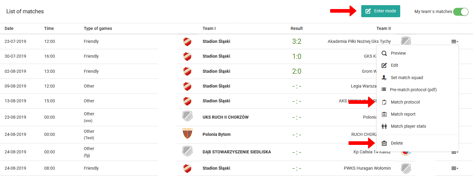 Έχετε δύο επιλογές για να ολοκληρώσετε το αποτέλεσμα. Βασικό και προηγμένο. Στη πρώτη μπορείτε να εισαγάγετε μόνο το σκορ του αγώνα. Για να το εισαγάγετε, κάντε κλικ στο πράσινο κουμπί "enter mode". Η δεύτερη, προχωρημένη επιλογή θα είναι διαθέσιμη από το μενού του αγώνα (τελευταία στήλη στον πίνακα). Για να μεταβείτε στην προχωρημένη ολοκλήρωση του αποτελέσματος του αγώνα, επιλέξτε την επιλογή "πρωτόκολλο αντιστοίχισης" από το μενού.