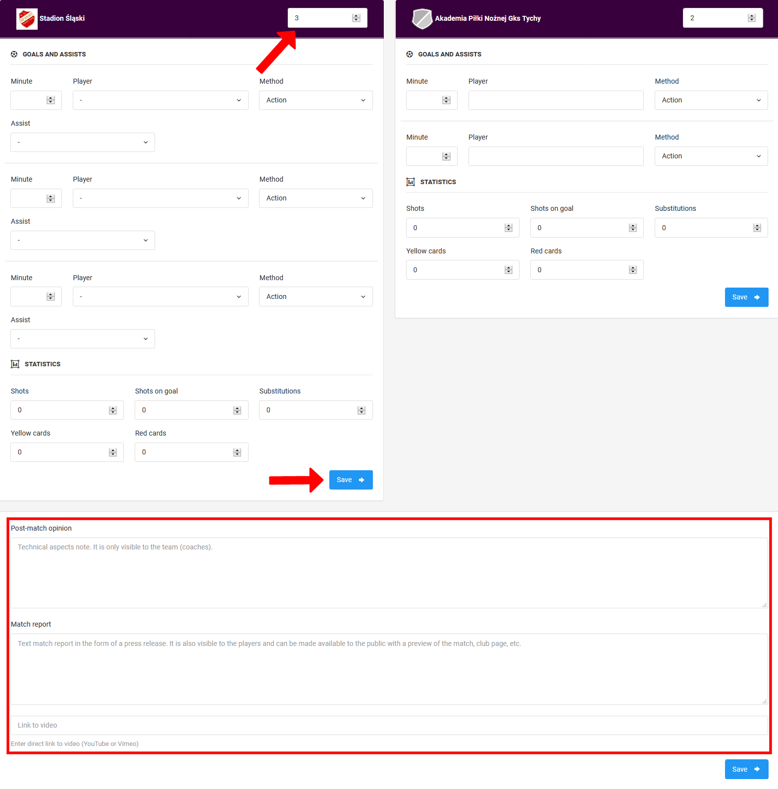 Η σύνθετη προβολή σάς επιτρέπει να εισαγάγετε εκτεταμένα στατιστικά στοιχεία για έναν συγκεκριμένο αγώνα. Σε αυτό το παράθυρο, ανάλογα με το επιλεγμένο άθλημα, μπορείτε να εισαγάγετε πληροφορίες σχετικά με: γκολ, πόντους, βοηθούς, σουτ, αντικαταστάσεις, πέναλτι και πώς σημειώθηκαν τα γκολ. Θυμηθείτε να αποθηκεύετε τη φόρμα κάθε φορά. Η αποθήκευση των ποσοτικών δεδομένων θα σας επιτρέψει επίσης να προσθέσετε ποιοτικά δεδομένα, όπως σκόρερ, στόχους βοηθού κ.λπ. Κάτω από τη φόρμα, θα βρείτε τρία πεδία κειμένου: γνώμη αγώνα, αναφορά αντιστοίχισης και σύνδεσμο για το βίντεο.
