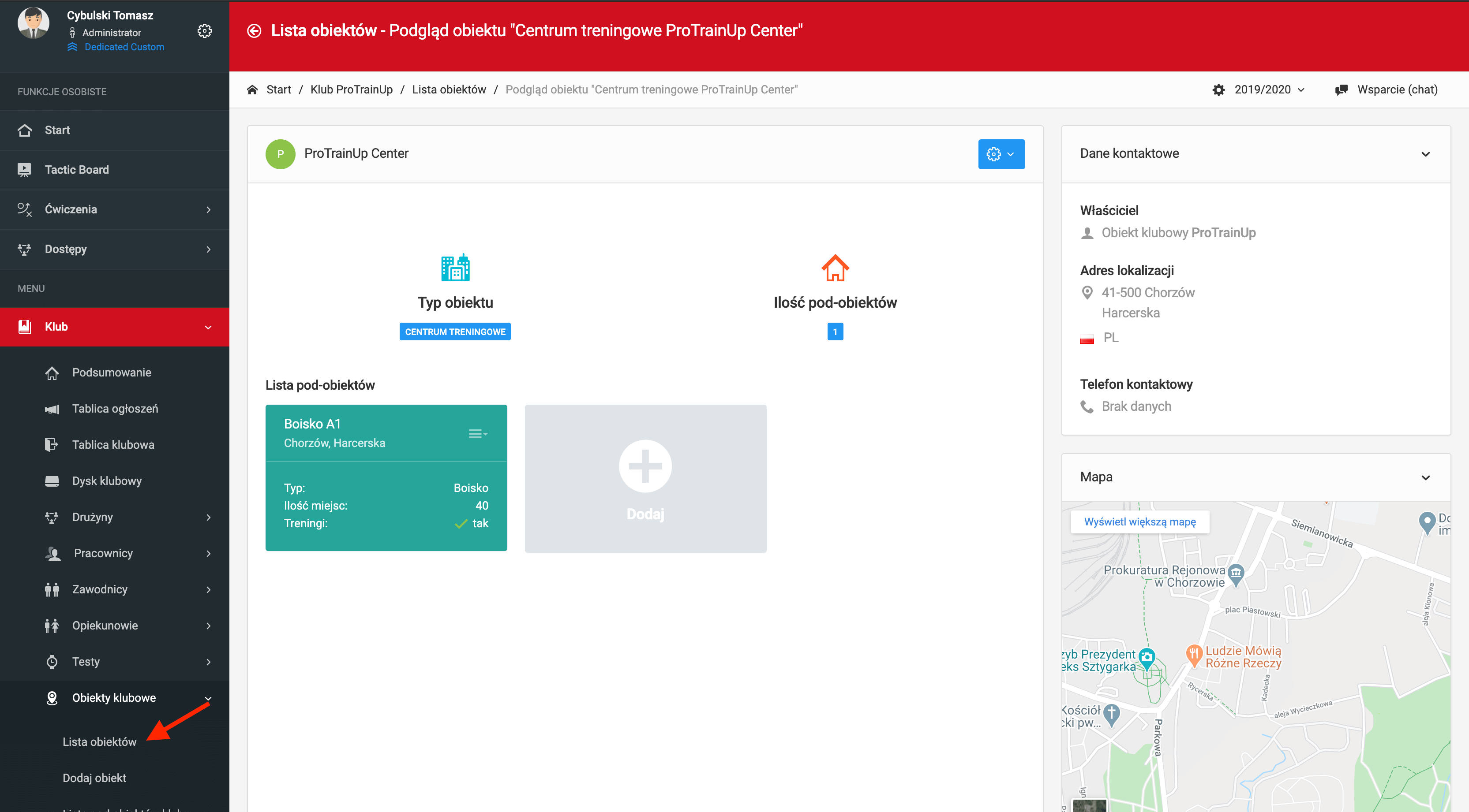 Aby podejrzeć dany obiekt wejdź w lewym menu w klub obiekty i rezerwacje lista obiektów i wybierz z menu (ostatnia kolumna) przy danym obiekcie pozycję "podgląd". Z tego też menu masz możliwość edytować oraz usunąć dany obiekt.