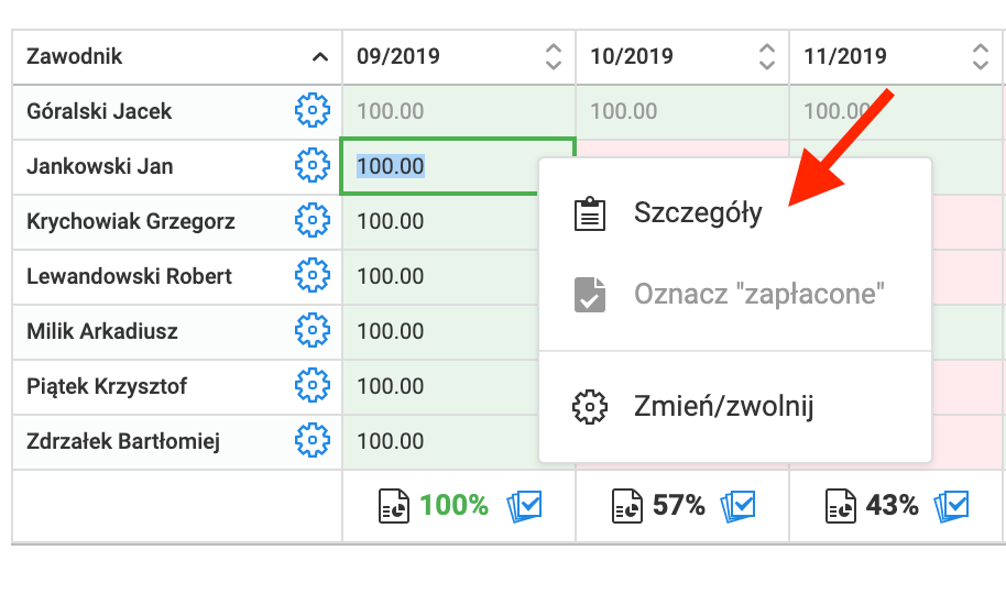 W systemie przechowywane są wszystkie detale związane z każdą pojedynczą płatnością. Aby się do nich dostać, naciśnij prawym przyciskiem myszy na wybraną komórkę i wybierz z listy pozycję "szczegóły". Po kliknięciu w tę pozycję, pojawi się okno z detalami płatności.