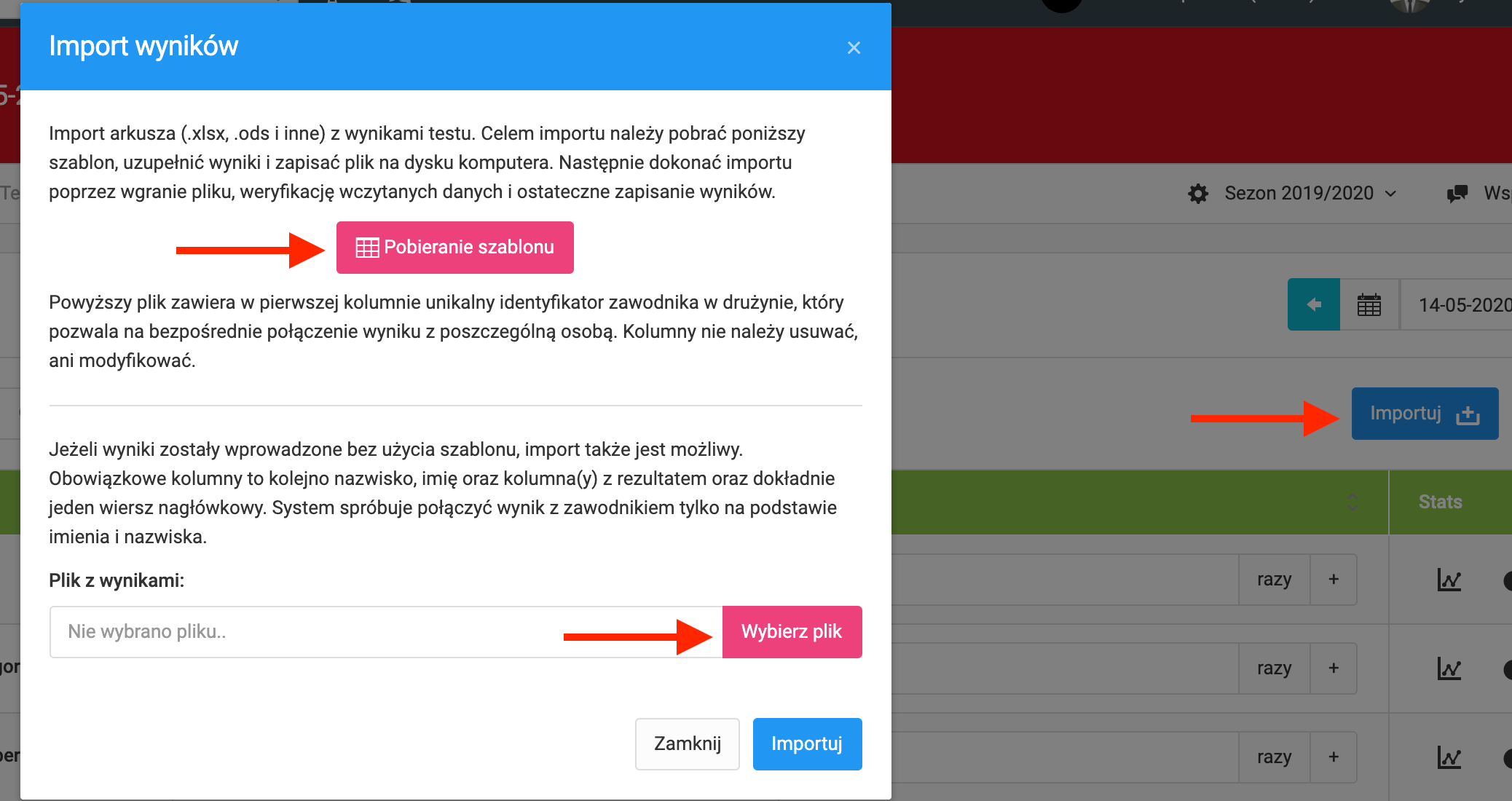 System daje możliwość zaczytania wyników testów z wcześniej przygotowanego pliku xls. Aby to zrobić, w oknie wprowadzania wyników testu kliknij w niebieską ikonkę "importuj". Klikniecie spowoduje pojawianie się okienka, w którym masz możliwość pobrania szablonu pliku lub wczytanie uzupełnionego już pliku xls. Chcąc mieć pewność, że dane zostaną dobrze zaczytane i przypisane do odpowiednich zawodników, polecamy korzystanie z szablonowego pliku xls.