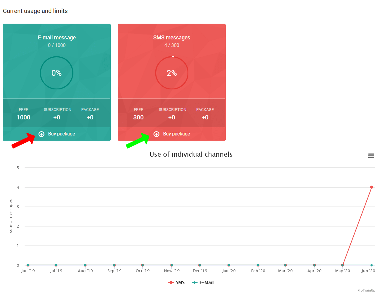 Tukaj lahko preverite tudi trenutno statistiko porabe paketa. Da kupite dodaten pokat preko SMS-a ali e-pošte, kliknite na gumb “kupi paket”, ki je prikazan na sliki. Po kliku nanj boste preusmerjeni na stran, kjer lahko kupite paket sporočil. Zapomnite si, da je vsak kupljen paket veljaven do zadnjega dne v mesecu! Neuporabljen paket se ne prenese na naslednji mesec!