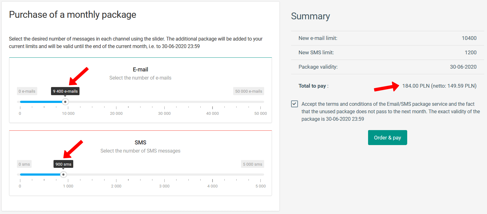 Za nakup dodatnega paketa sporočil prosim premaknite drsnike in izberite koliko SMS in e-poštnih sporočil želite kupiti. Cena paketov je odvisna od države, v kateri operira vaš klub. Po izbiri paketov bi morali potrditi pravila in klikniti "naroči in plačaj". Plačate lahko z DotPay. Vaš paket bo aktiven takoj po tem ko je plačilo sprovedeno.